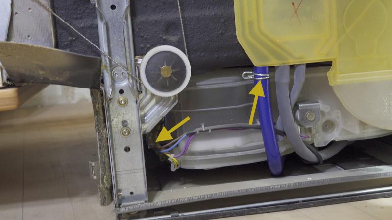 Im ersten Schritt werden die oberen Schrauben der Seitenwand entfernt. Danach wird die Schraube im unteren hinteren Bereich sowie die im vorderen Bereich unter der Gummidichtung entfernt, damit die Seitenwand weggezogen werden kann. Im Anschluss daran wird die Dämmplatte nach oben aufgeschlagen. Sichtbar wird nun der blaue Schlauch des Aquastops sowie das Kabel für die elektrische Versorgung.