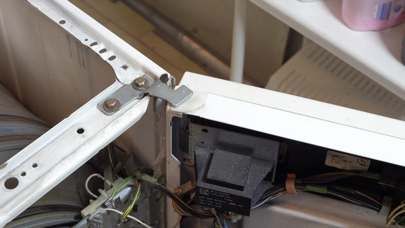 Als nächstes geht es an die Tür. Um die Tür zu montieren werden die Schrauben des oberen Scharniers gelockert und der Stift des Scharniers in den Rahmen der Tür eingesteckt und das Scharnier verschraubt. Nachdem die Tür wieder fixiert ist werden alle Kabeln angesteckt. Danach wird die Einfüllöffnung montiert.